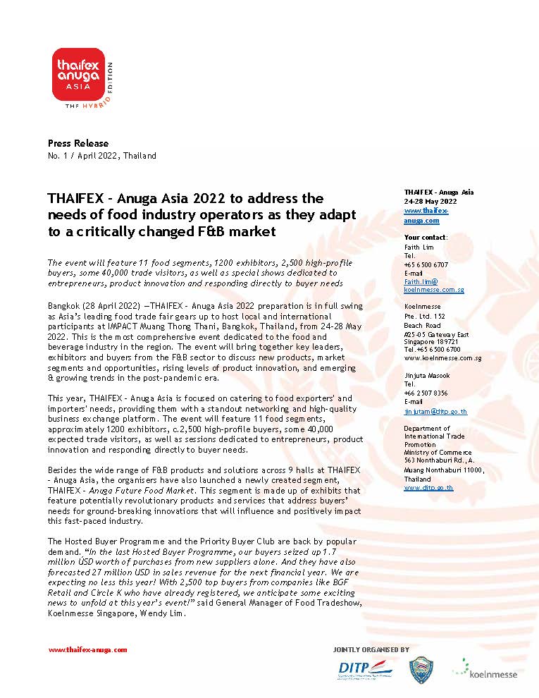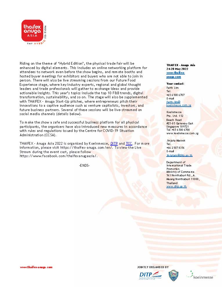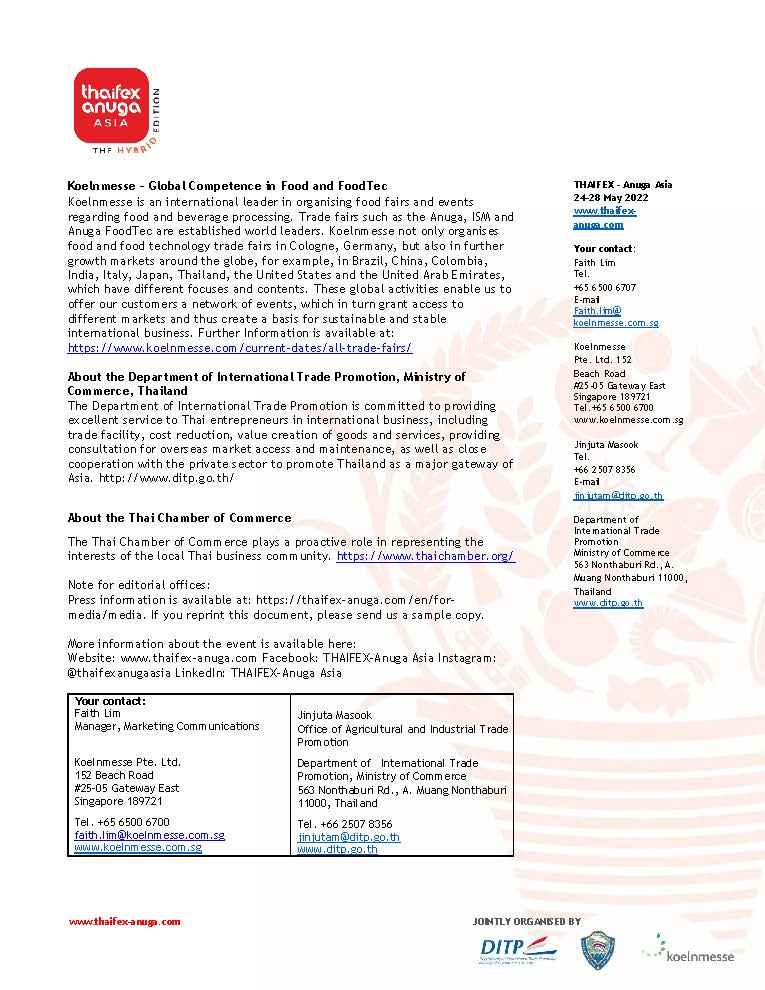 - THAIFEX – Anuga Asia 2022 to address the needs of food industry operators as they adapt to a critically changed F&B market